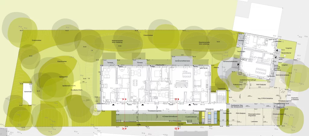 Ein erheblicher Teil unseres Grundstückes bleibt Gartenland mit Baumbestand. Den Garten werden wir bis auf die Terrassen gemeinschaftlich nutzen. Ebenso einen Gemeinschaftsraum, der das gemütliche Wohnzimmer für Gruppentreffen sein wird.