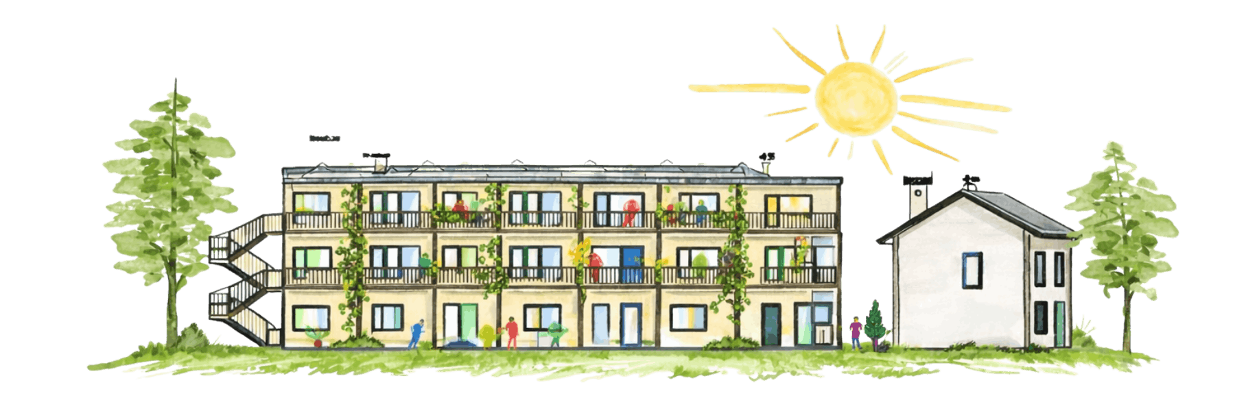In unserer Gemeinschaft gibt es auch eine Clusterwohnung mit fünf Wohneinheiten für insgesamt sieben Personen, die sich eine Gemeinschaftsküche und ein Wohnzimmer teilen.